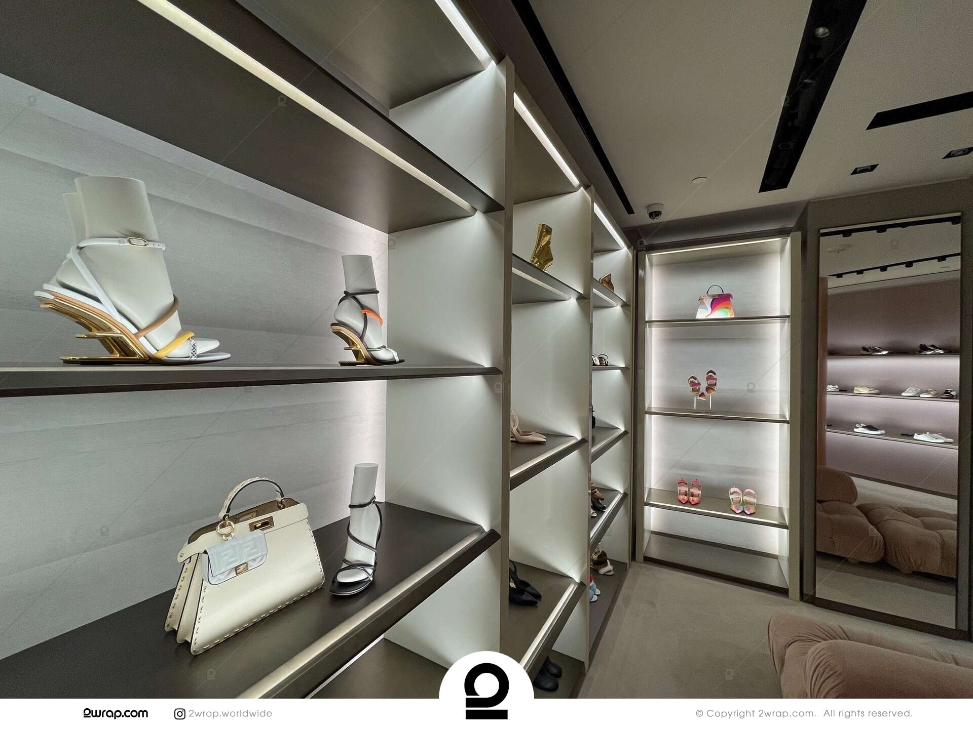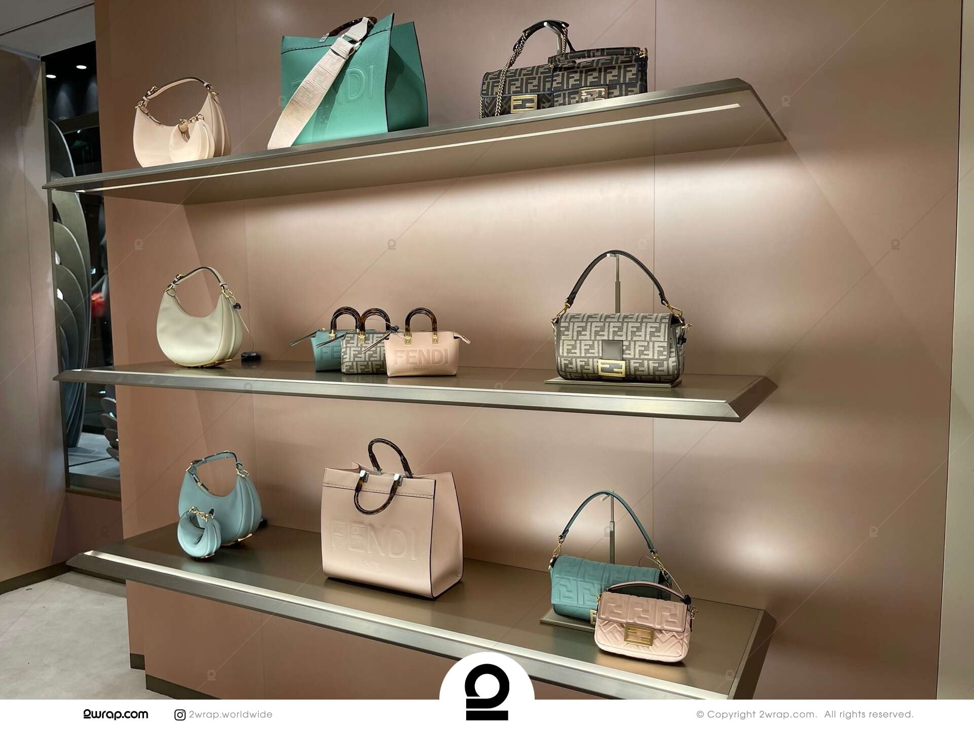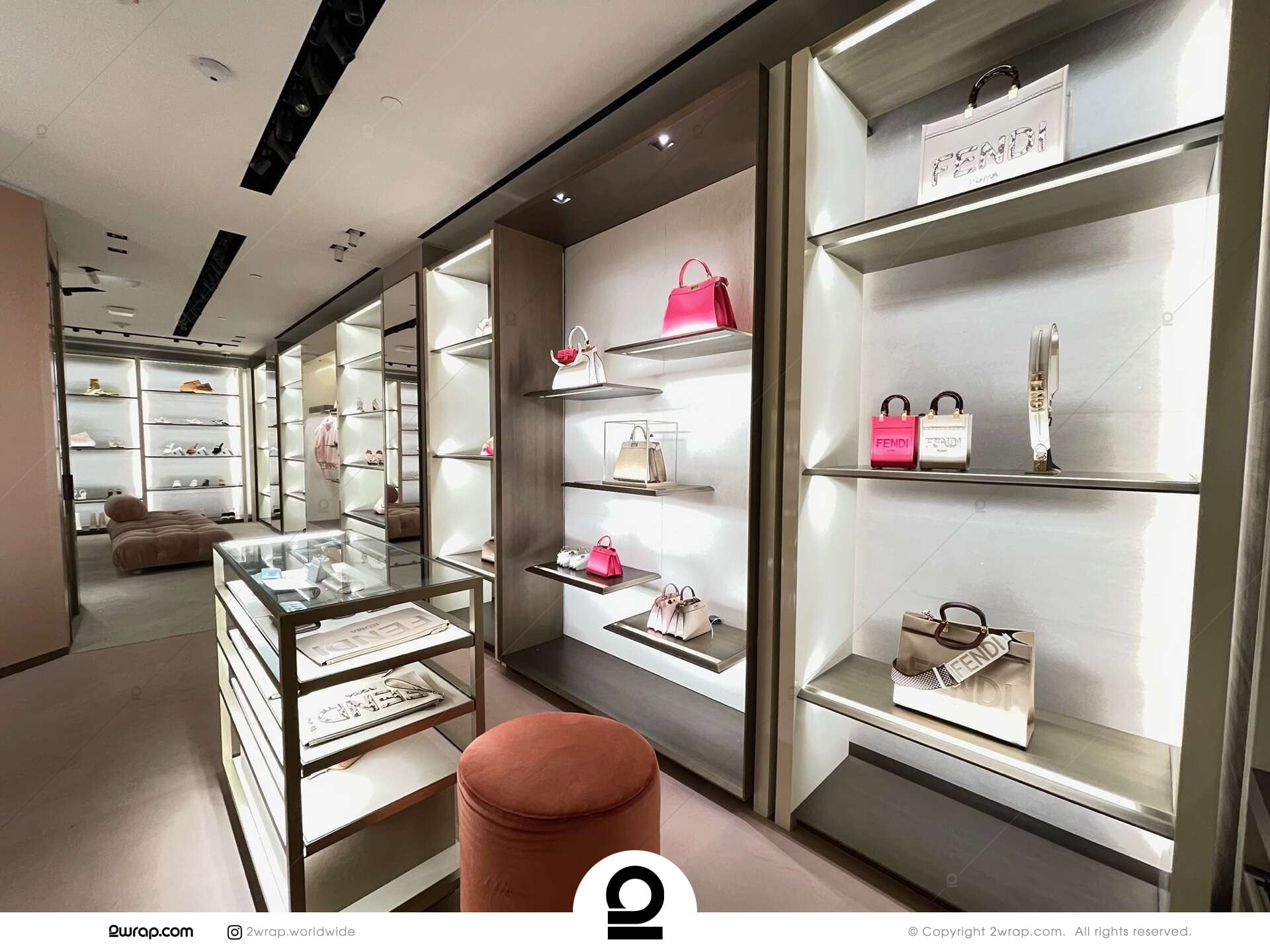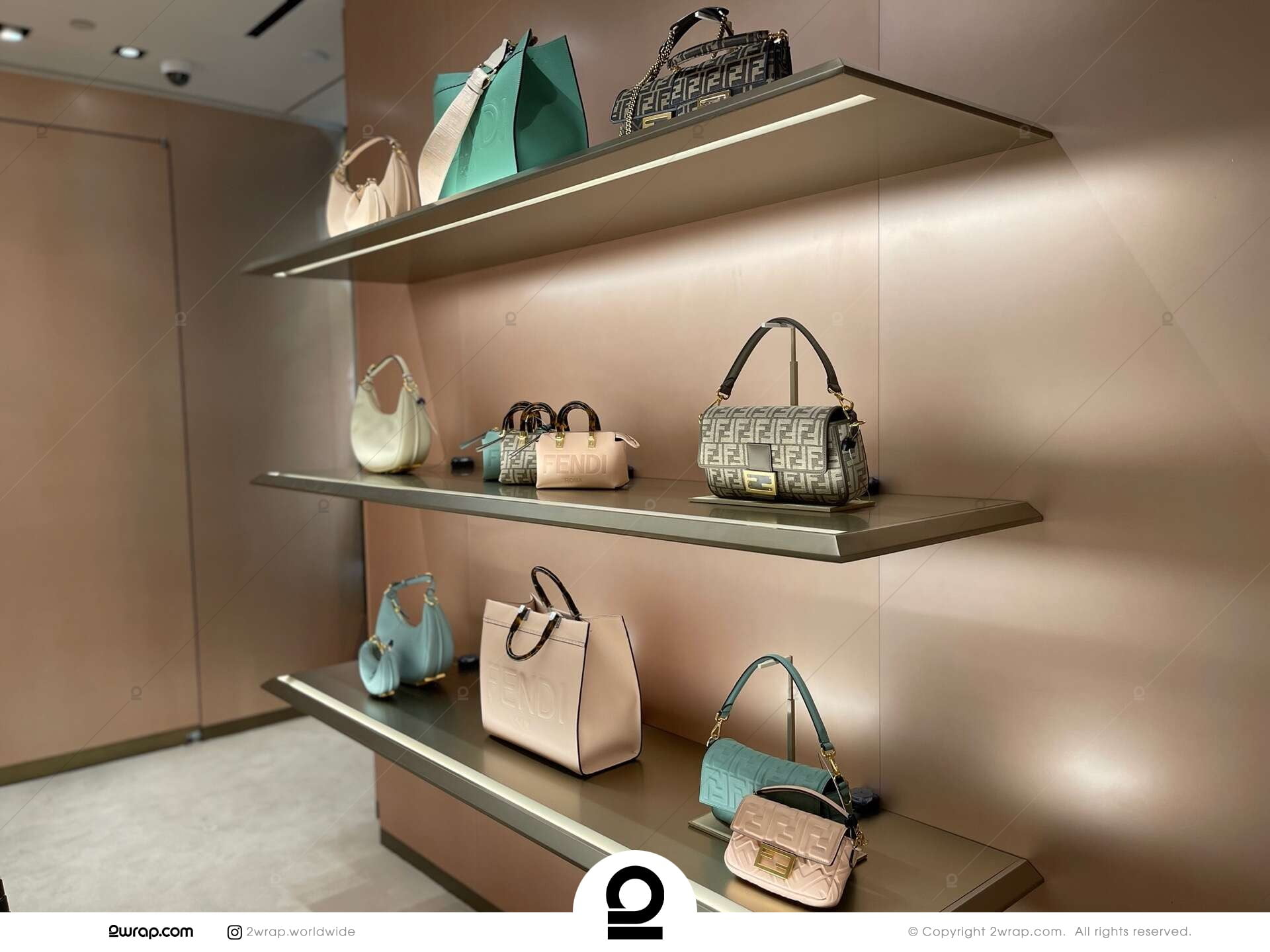 One of this project’s most notable aspects was the metamorphosis of the matte rose metallic walls. Fendi partnered with 2wrap.com to custom print these walls to achieve a seamless mix with the existing interior features. Consequently, the matte rose metallic theme was seamlessly incorporated, improving the boutique’s overall visual appeal.Ā Our attention to detail is demonstrated by the bespoke prints’ flawless match to the existing interior pieces, which was made possible by the accuracy and caliber of our work.