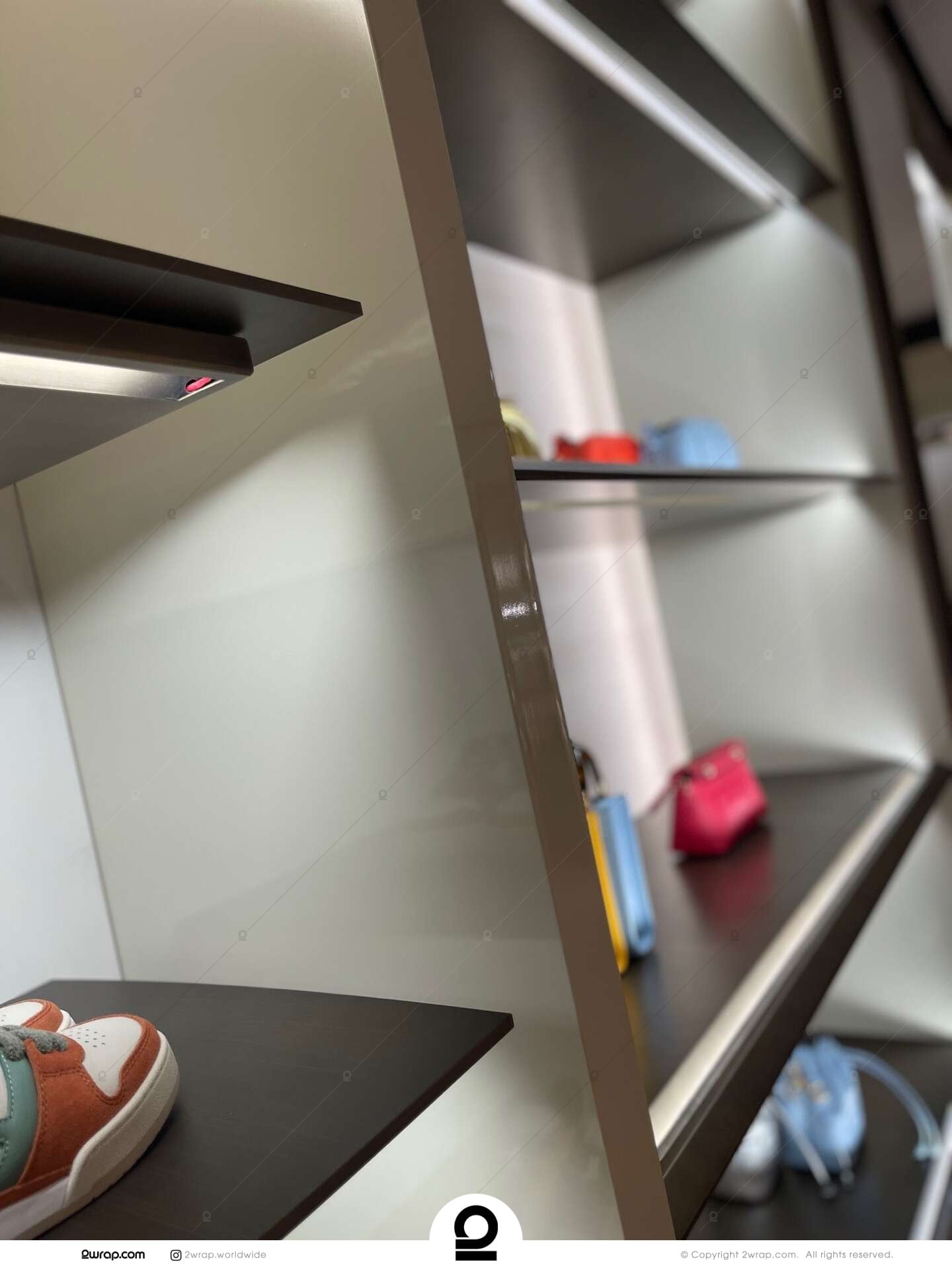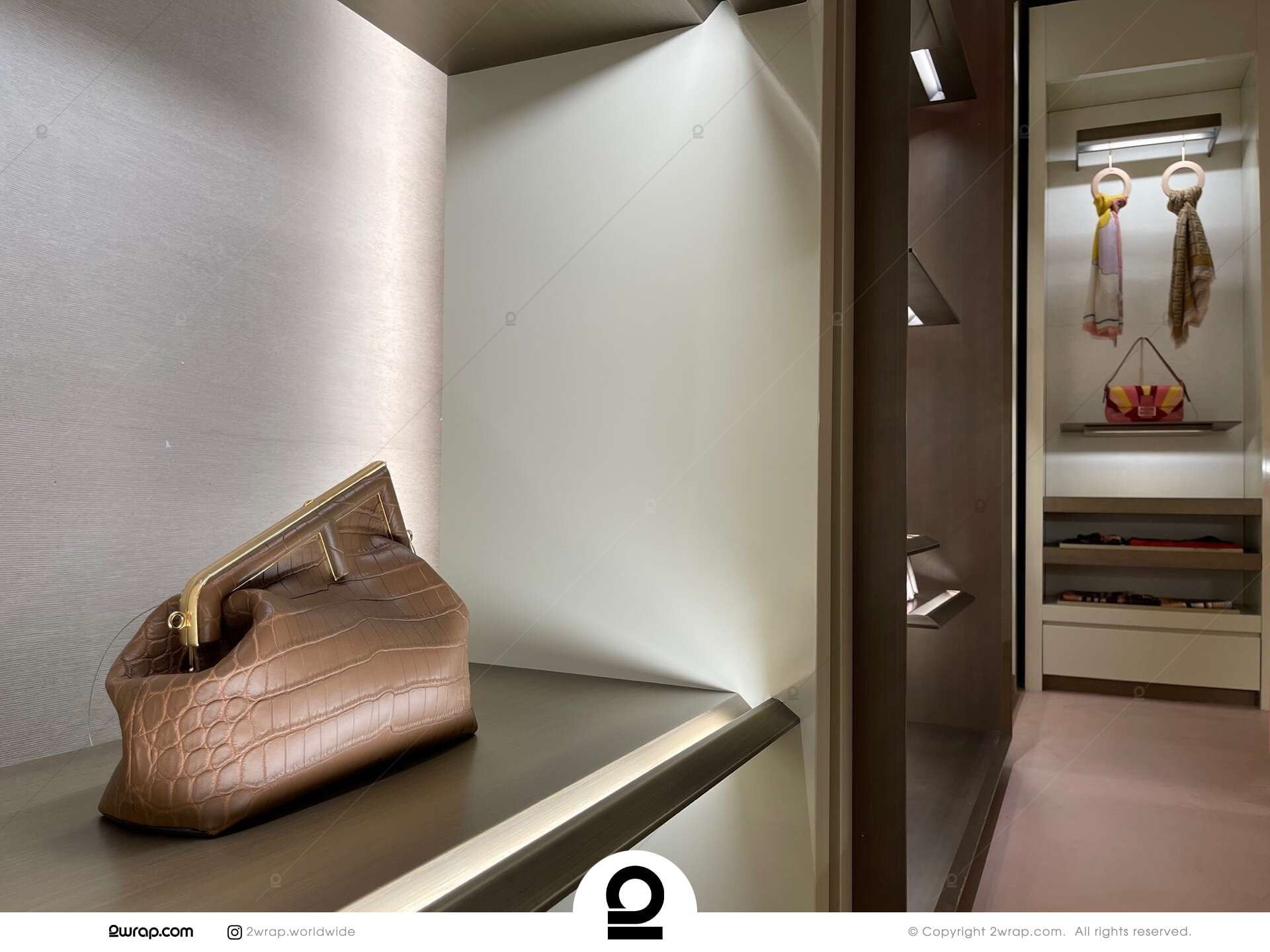 To start, we took down the old dark brown racks to create a blank canvas for a new, contemporary design. Fendi made the brilliant decision to cover the shelves with a gorgeous beige glossy vinyl that looked like high gloss paint. This decision gave the room new vitality and a hint of grandeur that went well with the sophistication linked with Versace and Fendi.