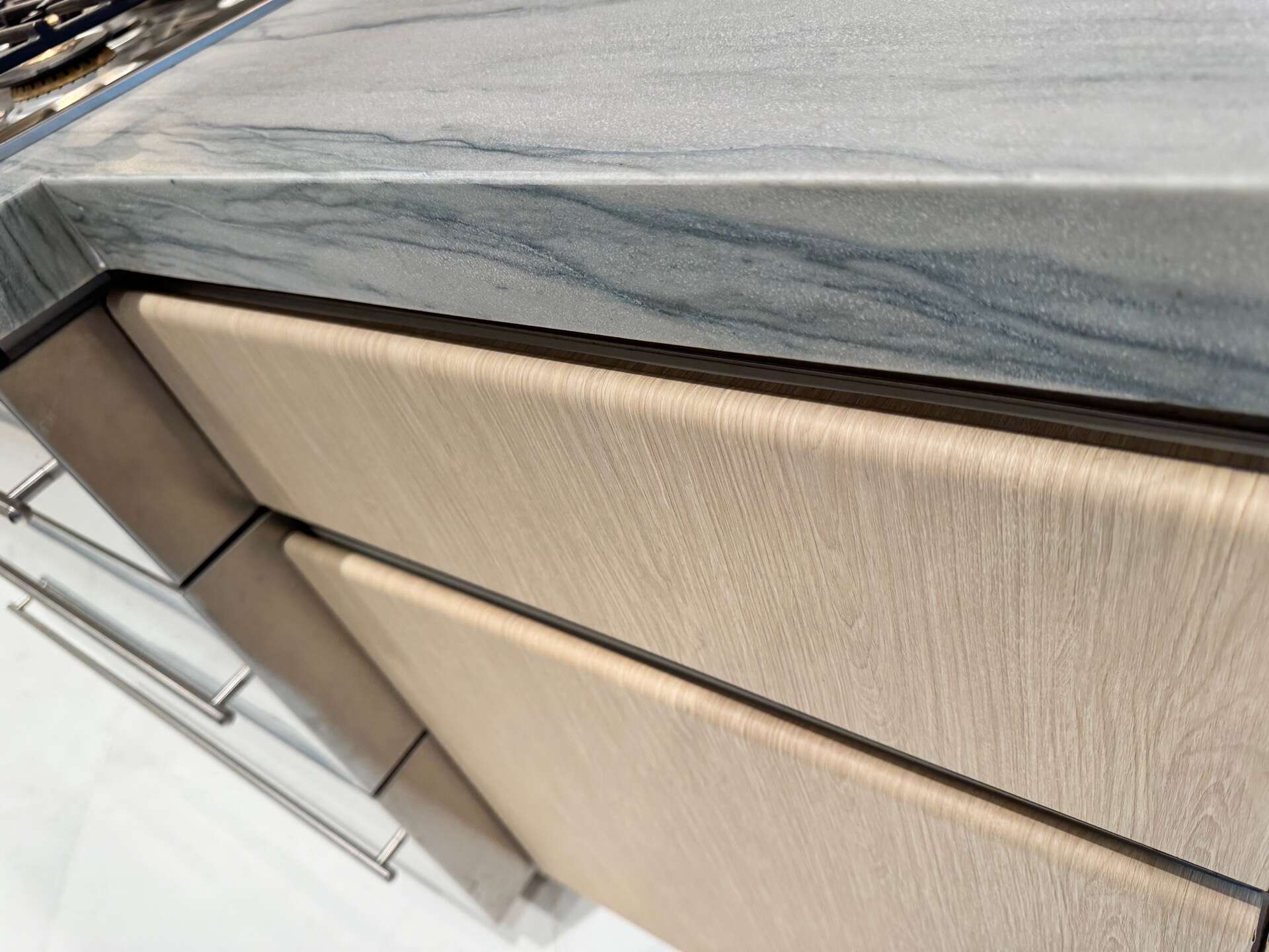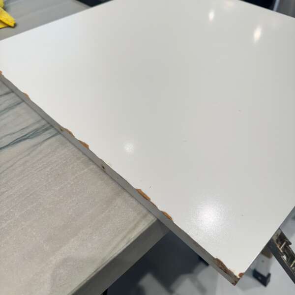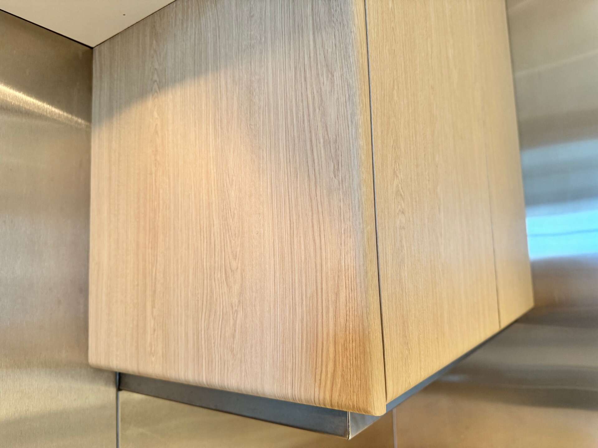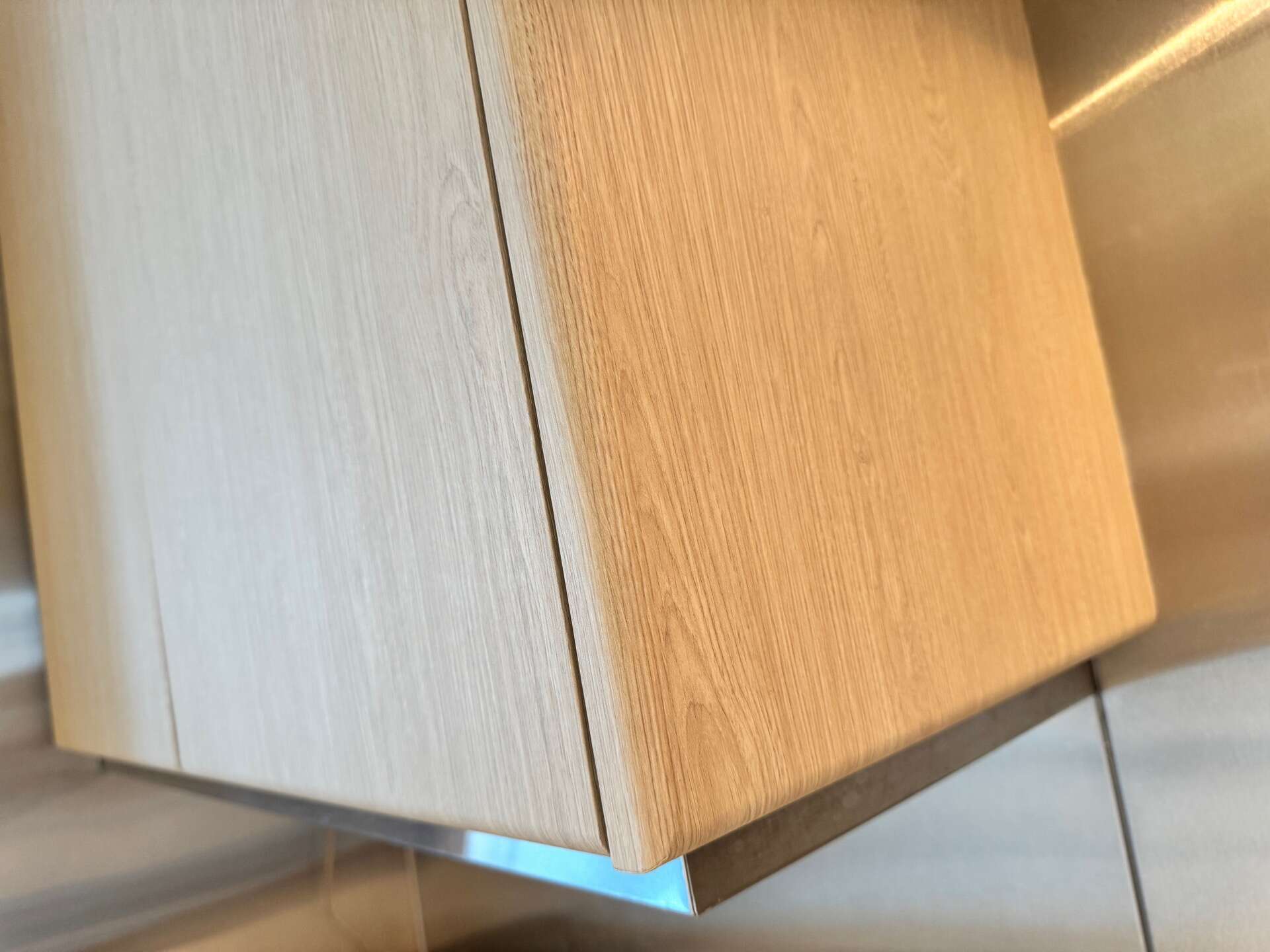 In this photo, you can see the original condition of a kitchen panel with visible imperfections, including minor water damage. Rather than replacing damaged parts, we offer a cost-effective solution using high-quality interior vinyl wrap, such as 3M Di-Noc interior film. Before applying the wrap, we carefully repair and smooth out any irregularities in the surface to ensure a flawless finish.